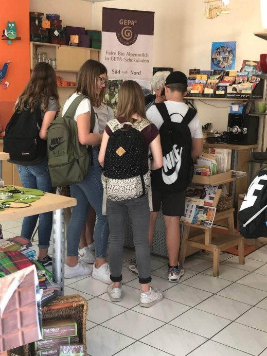 Auch das Thema “Schokolade und fairer Handel” wurde während den Aktionstagen aufgegriffen. Angeleitet durch Stephanie Lehrian (Dipl.-Biol. und Umweltpädagogin) und Johanna Kiefer (Dipl.-Geogr. und Umweltpädagogin) warfen die TeilnehmerInnen einen Blick hinter die Kulissen der Schokoladenproduktion: Entlang der Handelskette von der Kakaobohne bis hin zur fertigen Tafel Schokolade deckten sie unfaire Bedingungen auf und entwarfen Handlungsoptionen, um diese zu verändern. Das eigene Konsumverhalten wurde überdacht und positive und negative Aspekte des Fairen Handels und der ökologischen Landwirtschaft ausführlich diskutiert. Während eines Ausflugs in den Weltladen Oberursel und einer Rallye durch die Oberurseler Innenstadt wurden die Schülerinnen und Schüler angeregt, weitere Produkte aus den “Ländern des Südens” genauer unter die Lupe zu nehmen und sie unter dem Aspekt “Nachhaltigkeit” zu prüfen. Durch ausführliche Gespräche mit den Mitarbeiterinnen und Mitarbeitern des Weltladens, die Projekte des fairen Handels in Ländern wie Tansania durch eigene Besuche gut kennen, wurden diese lebendig. Leckere Kostproben wie in Ghana hergestellte Schokolade, fair gehandelte Nougat-Creme und getrocknete Mangostreifen rundeten den Vormittag ab. An dieser Stelle sei Frau Bentrup und dem Team des Weltladens Oberursel für das ansprechende und perfekt organisierte Angebot herzlich gedankt.